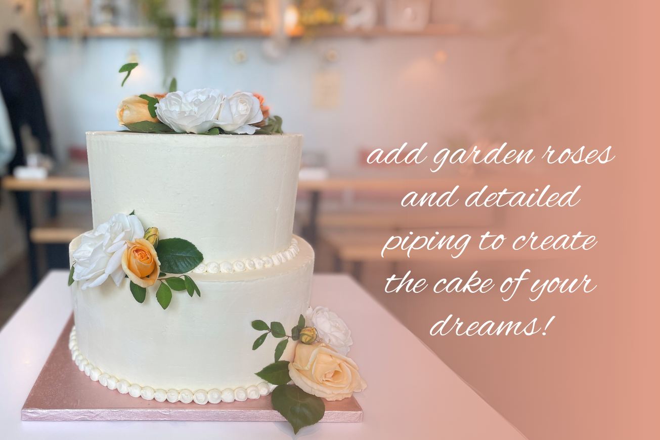 Make your celebration memorable with our two tier classic wedding cake. This two-tier cake features a smooth layer of buttercream, giving it a refined appearance and endless possibilities for your creativity. You can keep it simple or personalise it with flowers, fruits, macarons, nuts, drips, and cake toppers. Just let us know your decoration preferences two days in advance, and we’ll decorate your cake to match your vision, free of charge! Vegan or vegan & gluten free, from £320.