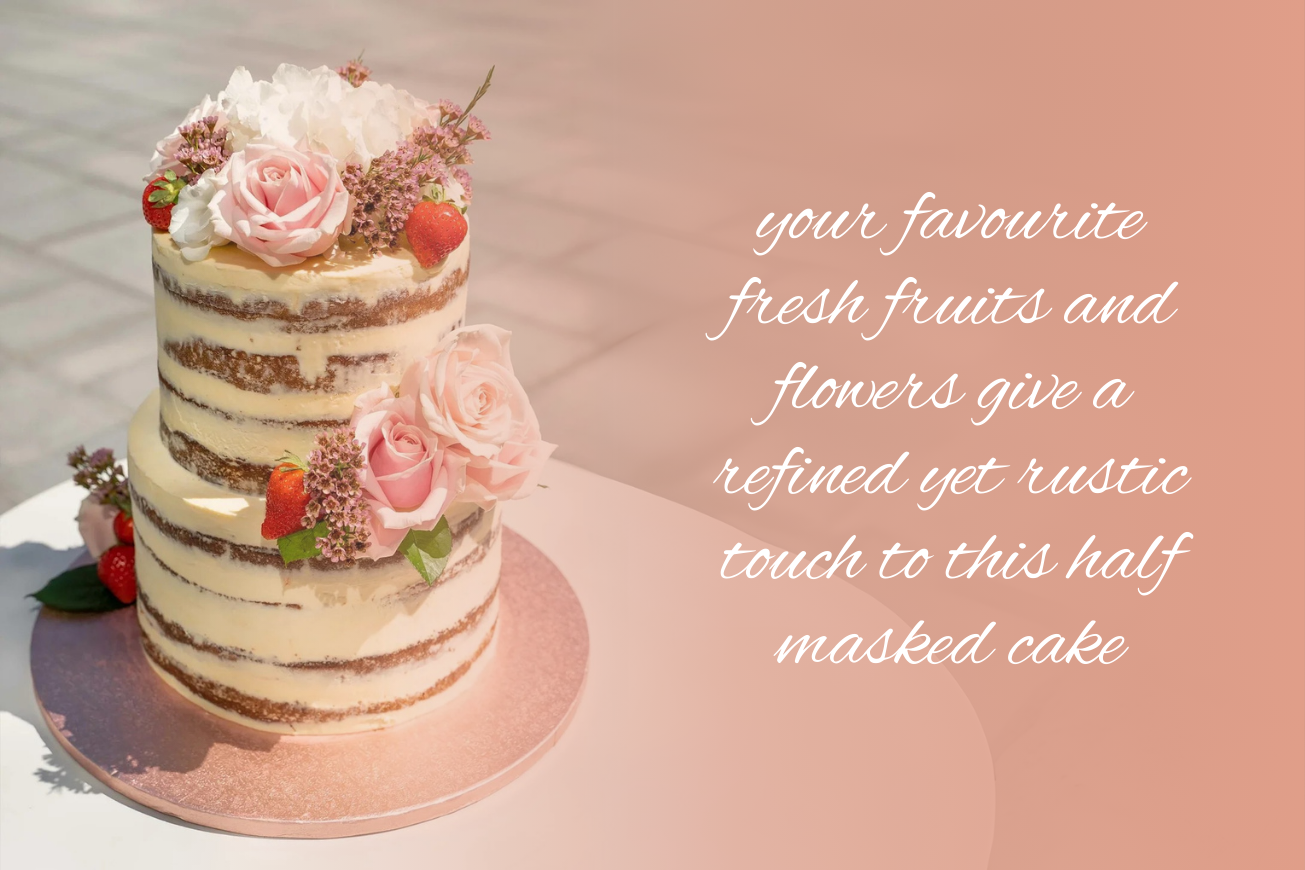 Our naked wedding cake is an ideal blank slate for your creativity. This two-tier cake features a minimal amount of buttercream, allowing the layers to show through for a rustic and elegant appearance. You can keep it simple or add your personal touch with flowers, fruits, macarons, nuts, drips, and cake toppers. Just inform us of your decoration preferences two days ahead, and we’ll dress up your cake just the way you want, at no extra cost!